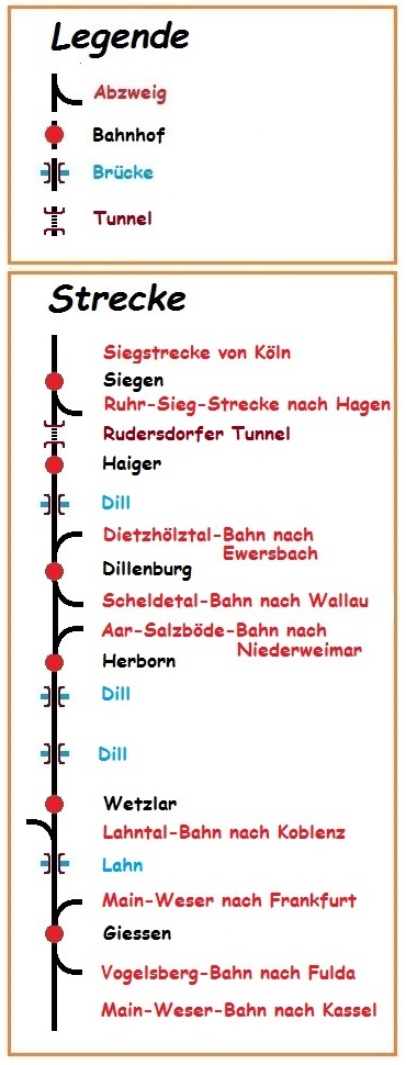 Die Strecke führt von Siegen über Haiger, Dillenburg,