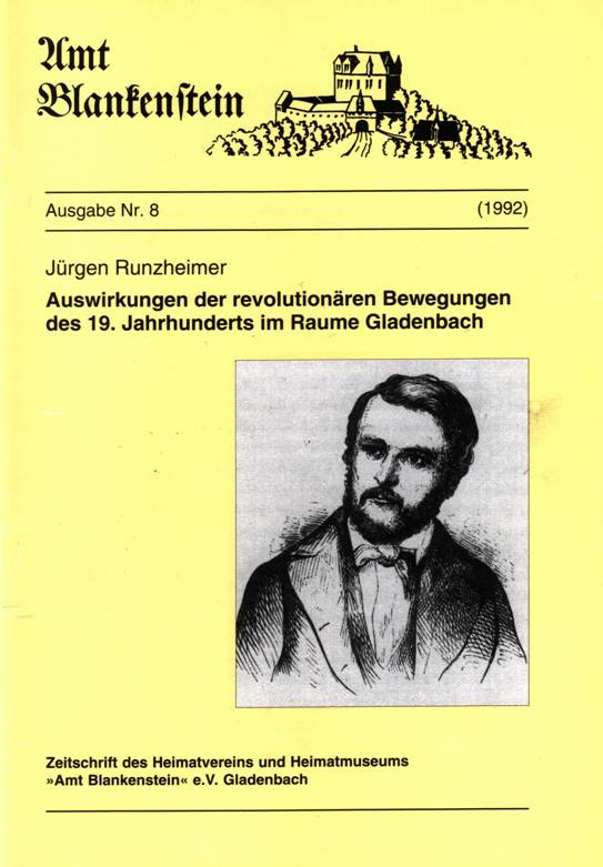| Inhalt: | Auswirkungen der revolutionären Bewegungen des 19. Jahrhunderts im Raume Gladenbach – Konspiration im Jahre 1833? – Das Zollvereinigungsfest auf der Zollbuche – Rektor Herzbergers Mißverständnisse – Ein Monument für den Landesherrn – Georg Plitt, der Rebell – Eine Posse in mehreren Teilen – Gladenbach und die gesamtdeutschen Parlamente 1848 – 1850 – Christian Deibel – Ein unfreiwilliger Emigrant – Frisch – Fromm – Fröhlich – Frei |